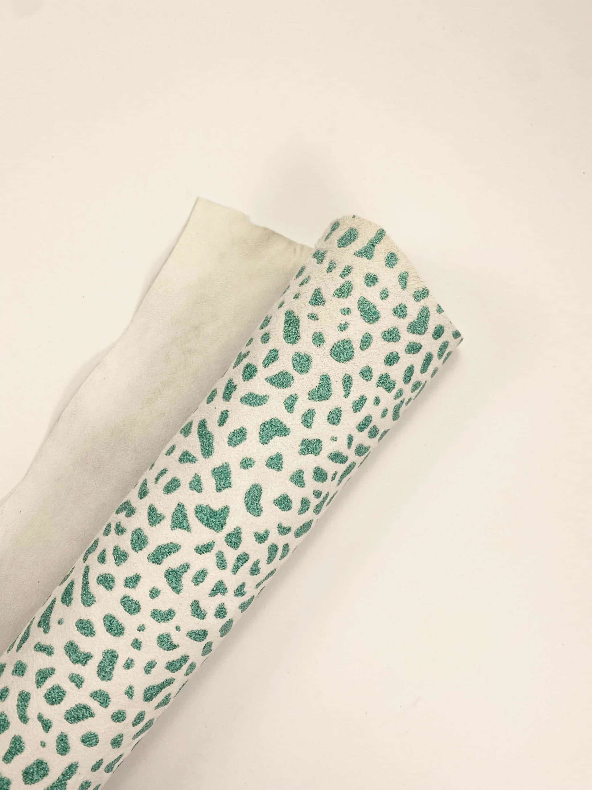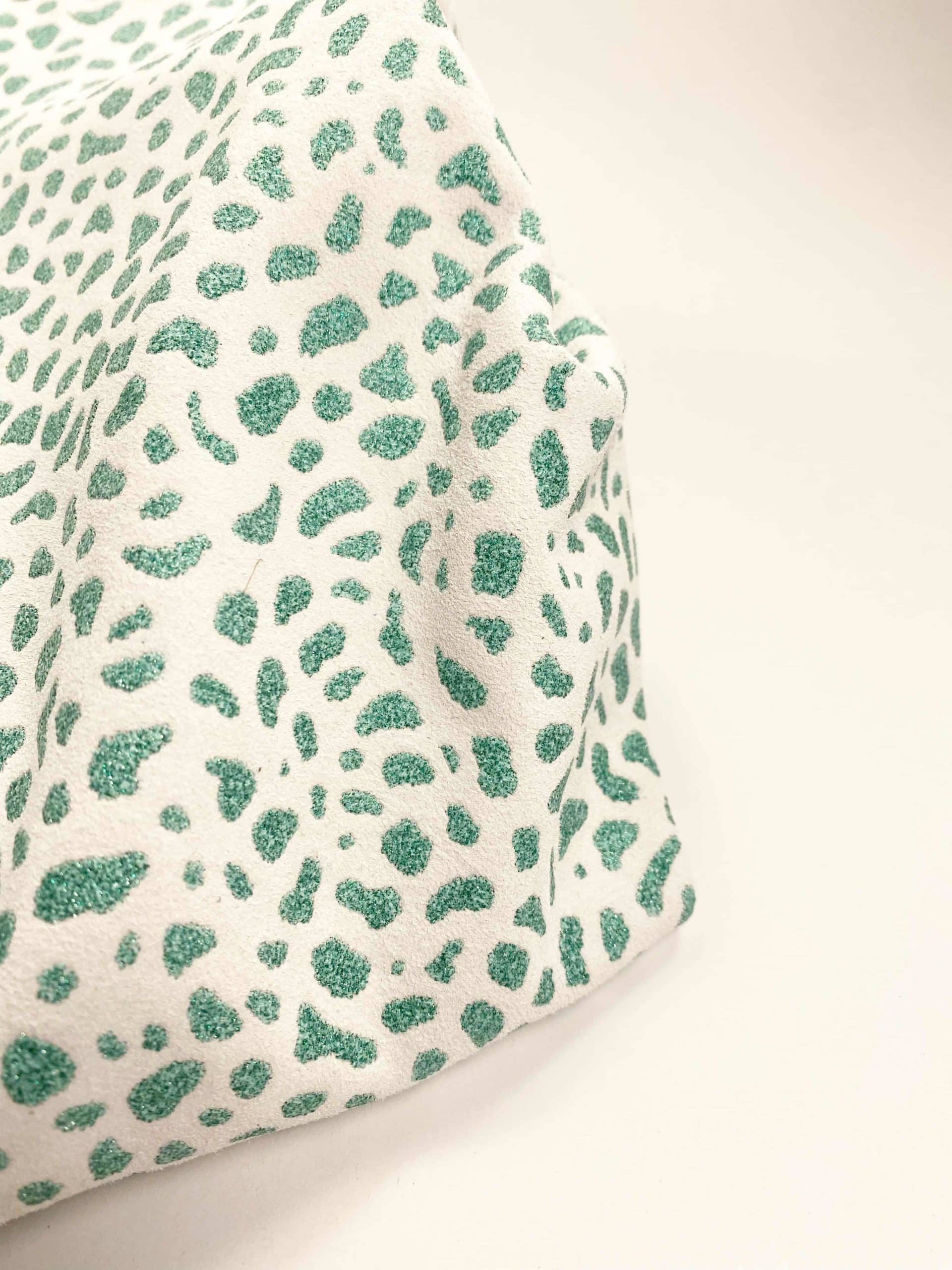 Make a truly unique pair of shoes with this beautiful and soft bright goat suede leather with green spotted pattern, finished with a glitter texture